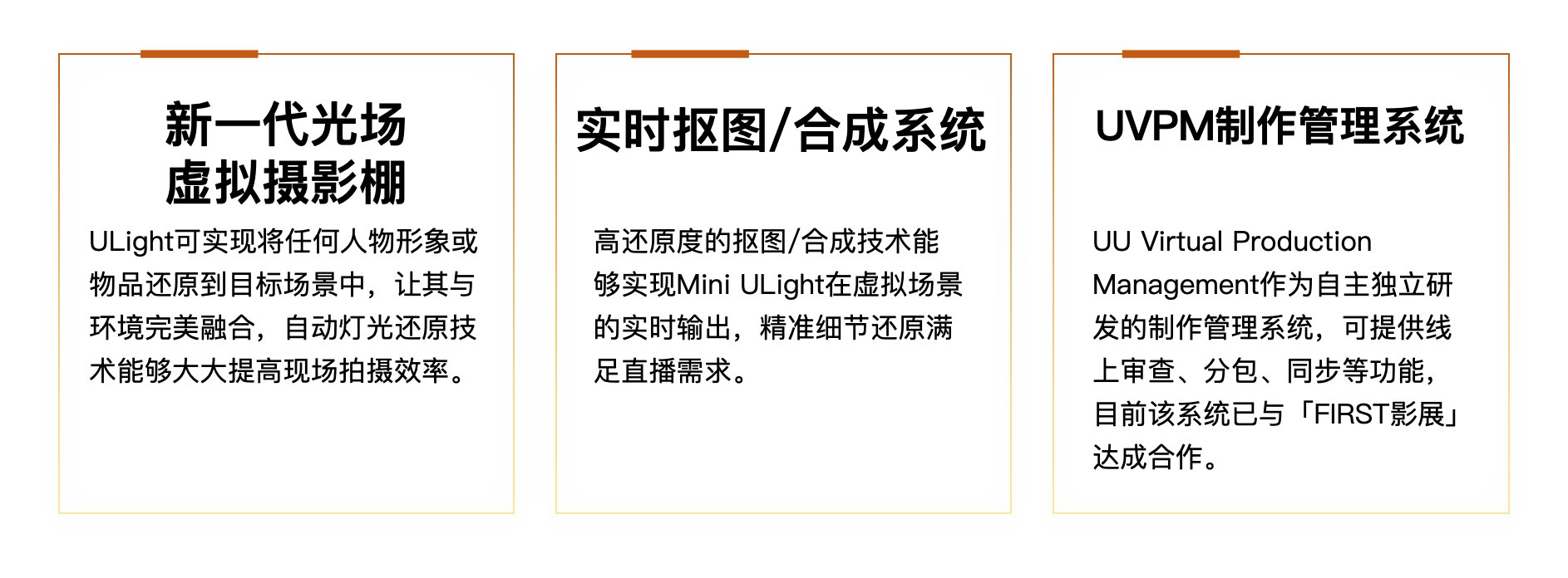 ULight智能光场依托多领域虚拟制作、数字资产管理、AI技术支撑,结合多年影视实践和智能光场技术迭代,为影视制片方、影像拍摄团队、广告公司、平台及品牌主等,提供全流程虚拟制作综合解决方案。